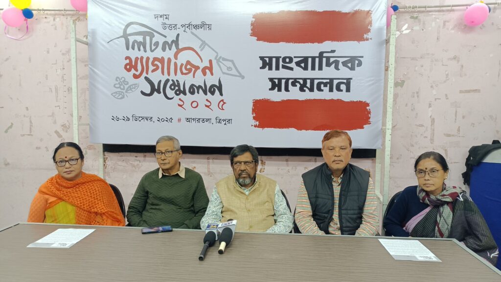 আগরতলা : দশম উত্তর পূর্বাঞ্চলীয় লিটল ম্যাগাজিন সম্মেলন-এর চার দিবসীয় অনুষ্ঠানমালা এবার আগরতলায় হচ্ছে। আগামী ২৬ ডিসেম্বর থেকে ২৯ ডিসেম্বর ২০২৫ পর্যন্ত এই সম্মেলনটি অনুষ্ঠিত হবে রবীন্দ্র শতবার্ষিকী ভবনে। উত্তর পূর্বাঞ্চলের বিভিন্ন স্থান থেকে প্রায় ১২৫ জন প্রতিনিধি (লিটল ম্যাগাজিনের সম্পাদক এবং লেখক) এবং ত্রিপুরা রাজ্যের বিভিন্ন প্রান্ত থেকে শতাধিক প্রতিনিধি এই চার দিনের কর্মসূচীতে হাজির থাকছেন। সম্পূর্ণ আমন্ত্রণমূলক এই সম্মেলনটি বিগত ২০২১ সালেও সফল ভাবে একবার আগরতলায় অনুষ্ঠিত হয়েছিল।
