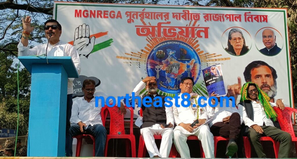 আগরতলা : মনরেগা বাঁচাও সংগ্রামের অঙ্গ হিসাবে প্রদেশ কংগ্রেসের লোক ভবন অভিযান। এইদিন স্বামী বিবেকানন্দ ময়দানের সামনে থেকে র্যা লি বের করে কংগ্রেস কর্মী সমর্থকরা। র্যা লিটি বুদ্ধ মন্দিরের সামনে গিয়ে শেষ হয়। সেখানে অনুষ্ঠিত হয় পথসভা। পথ সভায় ভাষণ দিতে গিয়ে কংগ্রেস বিধায়ক সুদীপ রায় বর্মণ বলেন সমগ্র দেশে ৯৮ হাজার সরকারি স্কুল বন্ধ হয়ে গেছে। সংসদে কেন্দ্রীয় মন্ত্রী তথ্য দিয়েছেন। শিক্ষা ব্যবস্থাকে বেসরকারি হাতে তুলে দেওয়ার প্রয়াস চলছে। প্রথম থেকে দশম শ্রেণী পর্যন্ত রয়েছে এমন ৩৬ হাজার স্কুলে ১ জন করে শিক্ষক রয়েছে। দেশের মধ্যে ৫০ হাজার শিক্ষকের শূন্য পদ পরে রয়েছে। এই শিক্ষক নিয়োগ করলে বছরে ২৫ থেকে ৫০ হাজার কোটি টাকা লাগবে। সরকার বলছে এই টাকা দিতে পারবে না। অথচ নির্বাচনী বৈতরণী পাড় হওয়ার জন্য সড়ে তিন লক্ষ কোটি টাকা ব্যয় করা হয়েছে। দেশ রসাতলে যাচ্ছে। এইটা উপলব্ধি করতে হবে। তথ্য জানার অধিকারকে সংশোধনী এনে দুর্বল করে দেওয়া হয়েছে। এইটা হচ্ছে দেশের বর্তমান পরিস্থিতি। চারিদিকে লুটপাট চলছে দেশের মধ্যে। গো মাংস রপ্তানি করার ক্ষেত্রে এক নাম্বারে রয়েছে ভারত। এই গো মাংস বিক্রেতা সংস্থার মানিক বড় বড় বিজেপি নেতা। নেশা কারবারের স্বর্গ রাজ্য ভারতবর্ষ। নেশার করাল গ্রাসে দিশেহারা ছাত্র-যুব সমাজ। একের পর এক স্কিমে দেশের মধ্যে দুর্নীতি চলছে বলেও অভিযোগ করেন সুদীপ রায় বর্মণ। সভায় সুদীপ রায় বর্মণ ছাড়াও উপস্থিত ছিলেন প্রদেশ কংগ্রেস সভাপতি আশীষ কুমার সাহা, কংগ্রেস বিধায়ক বিরজিৎ সিনহা, প্রাক্তন কংগ্রেস সভাপতি পীযূষ কান্তি বিশ্বাস সহ অন্যান্যরা। এই সভা থেকে ৬ জনের এক প্রতিনিধি দল লোক ভবনে গিয়ে রাজ্যপালের হাতে স্মারাক লিপি তুলে দেন।