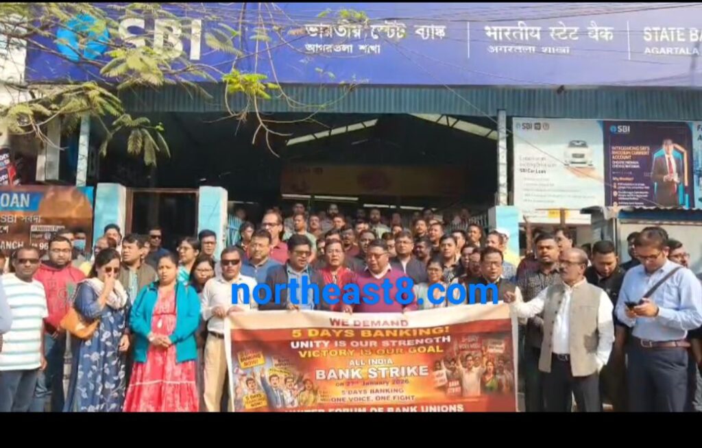 আগরতলা : পাঁচ দিনের কর্মসপ্তাহের দাবিতে মঙ্গলবার, ২৭ জানুয়ারি দেশজুড়ে ব্যাংক ধর্মঘটের ডাক দেয় ইউনাইটেড ফোরাম অফ ব্যাংক ইউনিয়নস-সহ একাধিক ব্যাংক কর্মী সংগঠন। এই ধর্মঘটের জেরে দেশের পাশাপাশি রাজ্যের বিভিন্ন রাষ্ট্রায়ত্ত ব্যাংকের শাখা বন্ধ থাকে।এদিন মেলার মাঠে স্টেট ব্যাংক অফ ইন্ডিয়ার সামনে বিক্ষোভ প্রদর্শন করেন ব্যাংক কর্মীরা। দাবি পূরণ না হলে আগামী দিনে আরও বৃহত্তর আন্দোলনের ইঙ্গিত দেন ইউনিয়ন নেতারা।যদিও এই ধর্মঘটের প্রভাব দেশের বেসরকারি ব্যাংকগুলিতে পড়েনি বলেই জানা যাচ্ছে, তবে রাষ্ট্রায়ত্ত ব্যাংক বন্ধ থাকায় চরম ভোগান্তির মুখে পড়তে হয় সাধারণ গ্রাহকদের। উল্লেখযোগ্যভাবে, শুক্রবার সরস্বতী পূজা, শনিবার চতুর্থ শনিবার এবং রবিবারের পর সোমবার প্রজাতন্ত্র দিবস—এই চার দিন টানা ব্যাংক বন্ধ থাকার পর মঙ্গলবারও ধর্মঘট হওয়ায় আর্থিক লেনদেন, চেক ক্লিয়ারেন্স ও জরুরি ব্যাংক পরিষেবা ব্যাহত হয়।ব্যাংক বন্ধ থাকায় বহু গ্রাহক শাখায় এসে ফিরে যেতে বাধ্য হন। বিশেষ করে বয়স্ক ও দূরদূরান্ত থেকে আসা গ্রাহকদের অসুবিধা চরমে ওঠে। পরিস্থিতি স্বাভাবিক করতে দ্রুত আলোচনার মাধ্যমে সমস্যার সমাধানের দাবি জানিয়েছেন গ্রাহকরা।