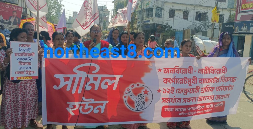 আগরতলা : জনবিরোধী, নারীবিরোধী ও কর্পোরেটমুখী কেন্দ্রীয় বাজেটের বিরুদ্ধে এবং আগামী ১২ই ফেব্রুয়ারি শ্রমিক ধর্মঘটের সমর্থনে সকল অংশের জনগণকে এগিয়ে আসার আহ্বানে বৃহস্পতিবার সারা ভারত গণতান্ত্রিক নারী সমিতি (AIDWA)-র পশ্চিম ত্রিপুরা জেলা কমিটির উদ্যোগে এক বিক্ষোভ মিছিল অনুষ্ঠিত হয়।মিছিলটি আগরতলার মেলার মাঠ থেকে শুরু হয়ে শহরের বিভিন্ন পথ পরিক্রমা করে প্যারাডাইস চৌমুহনীতে এসে শেষ হয়। মিছিল চলাকালীন অংশগ্রহণকারীরা কেন্দ্রীয় সরকারের বিরুদ্ধে বিভিন্ন স্লোগান তোলে। বিশেষ করে বাজেটে এমএন রেগা প্রকল্পে অর্থ বরাদ্দ বৃদ্ধি না করার প্রতিবাদে তারা স্লোগান তোলে—“বাজেটে এমএন রেগা প্রকল্পে অর্থ বরাদ্দ বাড়ানো হলো না কেন? মোদী সরকার জবাব চাই, জবাব দাও।মিছিল শেষে প্যারাডাইস চৌমুহনীতে এক বিক্ষোভ সভা অনুষ্ঠিত হয়। সভায় বক্তারা বলেন, বর্তমান কেন্দ্রীয় বাজেট সাধারণ মানুষ, শ্রমিক ও নারীদের স্বার্থকে সম্পূর্ণভাবে উপেক্ষা করেছে। কর্পোরেট স্বার্থ রক্ষার জন্য শ্রমজীবী মানুষের ন্যায্য দাবি উপেক্ষিত হচ্ছে বলে অভিযোগ তোলেন তারা।বক্তারা আগামী ১২ই ফেব্রুয়ারির শ্রমিক ধর্মঘটকে সফল করতে সর্বস্তরের মানুষকে ঐক্যবদ্ধভাবে অংশগ্রহণ করার আহ্বান জানান।