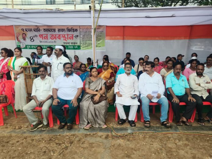 আগরতলা : বৃহস্পতিবার ৭ দফা দাবি আদায়ের লক্ষ্যে রাজ্য ব্যাপী গন অবস্থান সংগঠিত করল প্রদেশ কংগ্রেসের একাধিক শাখা সংগঠন। রাজধানী আগরতলা শহরের রাধানগর বাস স্ট্যান্ড সংলগ্ন এলাকায় এই গনঅবস্থান সংগঠিত করা হয়। নেশা কারোবারীদের বিরুদ্ধে কঠোর আইনানুগ ব্যবস্থা গ্রহণ, সরকারি দপ্তরের সকল শূন্য পদ পূরণ, সরকারি শিক্ষা ব্যবস্থা বেসরকারিকরণ বন্ধ করা, ধর্ষণ, খুন সহ সাধারণ আইনশৃঙ্খলা রক্ষায় ব্যর্থ পুলিশকে স্বাধীনভাবে কাজ করার সুযোগ প্রদান, ১২৫ তম সংবিধান সংশোধনী বিল অবিলম্বে পার্লামেন্টে পাস করানো, ককবরক ভাষাকে রোমান হরফে লেখার সরকারি অনুমোদন প্রদান, অটো, টমটম, ই-রিকশা চালকদের হয়রানি বন্ধ করে সঠিক পরিকল্পনা গ্রহণ করা এবং নিত্য প্রয়োজনীয় সামগ্রী আকাশচুম্বী মূল্যবৃদ্ধি হ্রাস করার দাবিতে এই গনঅবস্থান সংগঠিত করা হয়। উপস্থিত ছিলেন প্রদেশ কংগ্রেস সভাপতি আশিস কুমার সাহা, কংগ্রেস বিধায়ক সুদিপ রায় বর্মণ সহ অন্যান্যরা। গনঅবস্থানে বক্তব্য রাখতে গিয়ে সুদিপ রায় বর্মণ বলেন বর্তমানে বিভিন্ন সরকারি দপ্তরে ৫১ হাজার শূন্য পদ রয়েছে। অথচ সরকারে আসার পূর্বে বিজেপি বছরে ৫০ হাজার চাকুরি প্রদানের আশ্বাস দিয়েছে। কোথায় গিয়েছে সেই প্রতিশ্রুতি। বর্তমানে একটা নিয়োগ প্রক্রিয়া সম্পন্ন করতে ২ থেকে ৩ বছর লেগে যায়। নার্সিং পাশ করা ছেলে মেয়েরা বর্তমানে চাকুরির জন্য ঘুরে বেড়াচ্ছে। সরকারি চাকুরির জন্য পরীক্ষা নেওয়া হয়। কিন্তু পরীক্ষা নেওয়ার পূর্বে ঠিক হয়ে যায় কারা কারা পরীক্ষায় পাশ করবে।
